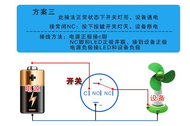 接線步驟:電源正極接C腳和LED正極,NC腳接到設(shè)備正極,電源負(fù)極接LED和設(shè)備負(fù)極。